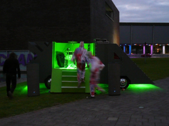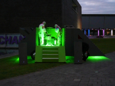 En dan hadden we nog de Belgische invasie van Quasar Noise Lab, het collectief van Philip Metten. Drie optredens stonden er gepland, waarvan twee bij nacht. De noise van de bandleden Aldo Struyf en Dave Schroyen was niet zozeer hard maar wel heel erg diep, met een spectaculaire nagalm die van een verlaten truck minutenlang bleef rondzingen. We waren al bang dat onze speakers het niet zouden overleven. En inderdaad, ze gingen dwars door de veiligheidsklep heen....