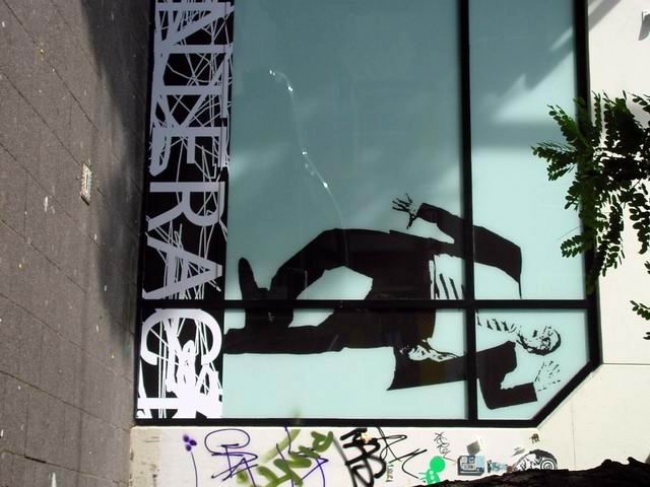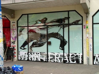 De Franse kunstenaar WK Interact speelt op verrassende wijze met het thema geweld die in massamedia, reclame en film worden gebruikt.