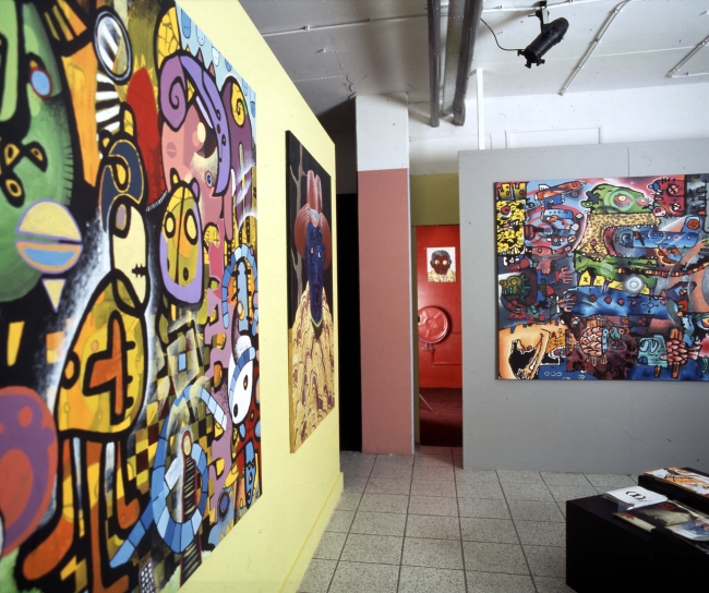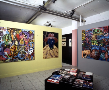 Een heel andere manier van werken heeft Gert-Jan van den Akerboom. Hij schildert meer op gevoel. Heeft Van Schie maar één idee verwerkt in zijn schilderijen, in de schilderijen van Van den Akerboom wemelt het van ideeën. Laag over laag over laag. Je blijft er naar kijken en je ontdekt steeds meer leuke en onverwachte dingen. Zie ik daar een zelfportret? Ja, dat klopt! Ook dat is verwerkt in een van de schilderijen. Felle kleuren, mensachtige figuren, ogen, bloemen, vissen, vogels en steeds meer dingen ontdek je in zijn schilderijen.