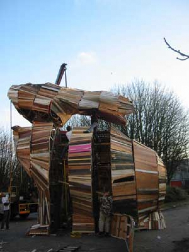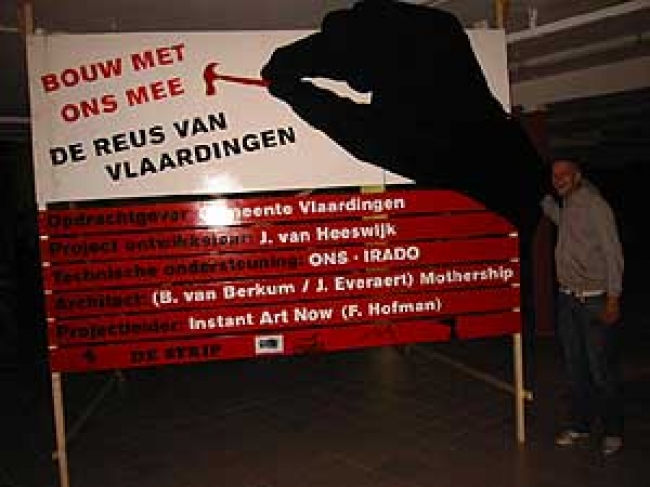 10 meter hoog van hout: 'De Reus van Vlaardingen'.Projectleider en kunstenaar Florentijn Hofman heeft een achtergrond als beeldhouwer en is een ervaren begeleider van kunst-educatieve trajecten.De MAMA-dependance op de Strip werd een houtwerkplaats.