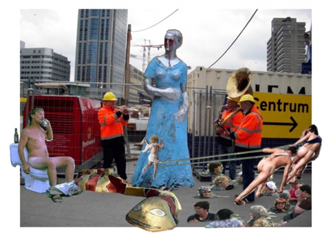 Zeven vierdejaars studenten van de opleiding Autonome Beeldende Kunst lichten met een grote collage een tipje van de sluier op van de eerstvolgende tentoonstelling: Lizzie Fitch/Ryan Trecartin. Deze is vanaf 21 januari 2012 te zien. Het centrale thema in het werk van Trecartin en Fitch is de hedendaagse consumptiemaatschappij die zij op absurdistische wijze weergeven. Dit is onder andere te zien in zeer drukke en chaotische films, waarin naast vele acteurs ook zijzelf regelmatig voorkomen. Hun werk is groots, absurd, theatraal en een totaalbeeld voor de toeschouwer.