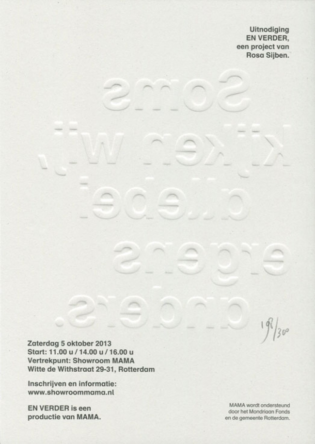 In oktober presenteert MAMA het project EN VERDER van Rosa Sijben. In dit project vinden drie expedities plaats vanuit MAMA. Op de fiets begeven de deelnemers zich naar een nog niet bekendgemaakte locatie voor een intrigerende en vervreemdende performance.