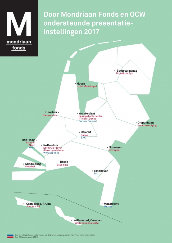 De presentatie-instellingen die nu een bijdrage krijgen zijn: Ateliers’89 (Oranjestad, Aruba), de Appel arts centre (Amsterdam), DSPS/De Player (Rotterdam en verschillende locaties), Hotel Mariakapel (Hoorn), If I Can’t Dance, I Don’t Want To Be Part Of Your Revolution (Amsterdam en verschillende (inter)nationale locaties), Instituto Buena Bista (Willemstad, Curaçao), Kunsthuis SYB (Beetsterzwaag), Nest (Den Haag), Nieuwe Vide (Haarlem), Showroom MAMA (Rotterdam), Stroom (Den Haag), Vleeshal (Middelburg).