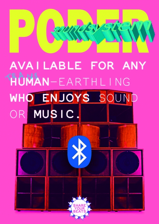 Poder Soundsystem is beschikbaar voor iedere (trans)menselijke aardbewoner die van muziek of geluid geniet. Het is een geluidssysteem waarop je muziek kunt afspelen via bluetooth als deel van Caetano’s solotentoonstelling Is There Any World To Come?
