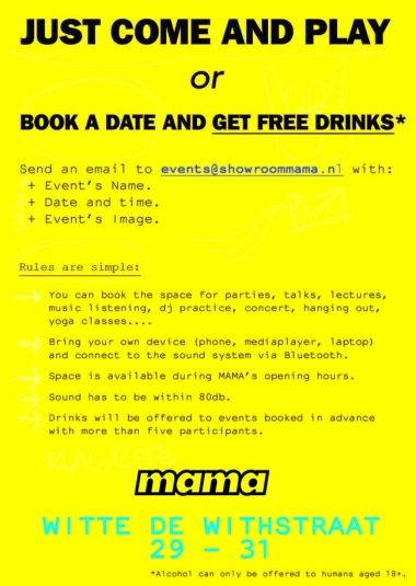 Je kunt de ruimte boeken voor feesten, lezingen, workshops, het luisteren van muziek, het oefenen van je dj kunsten, concerten, yoga lessen etc. Stuur een mail naar events@showroommama.nl met de naam van het evenement, evenementafbeelding, datum en tijd om de ruimte te reserveren. Nog open tot 2 april.